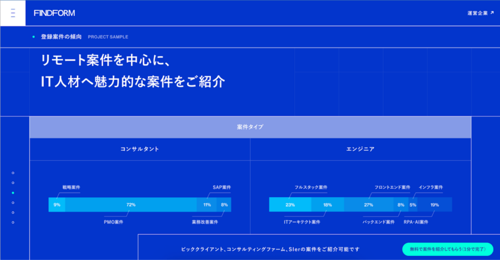 FINDFORMでは、マネジメント(PM・PMO)や上流SEの案件も多く紹介されている点が特徴です。そのため、マネジメントや開発経験のある方は、FINDFORMのサービスとの親和性は高いでしょう。